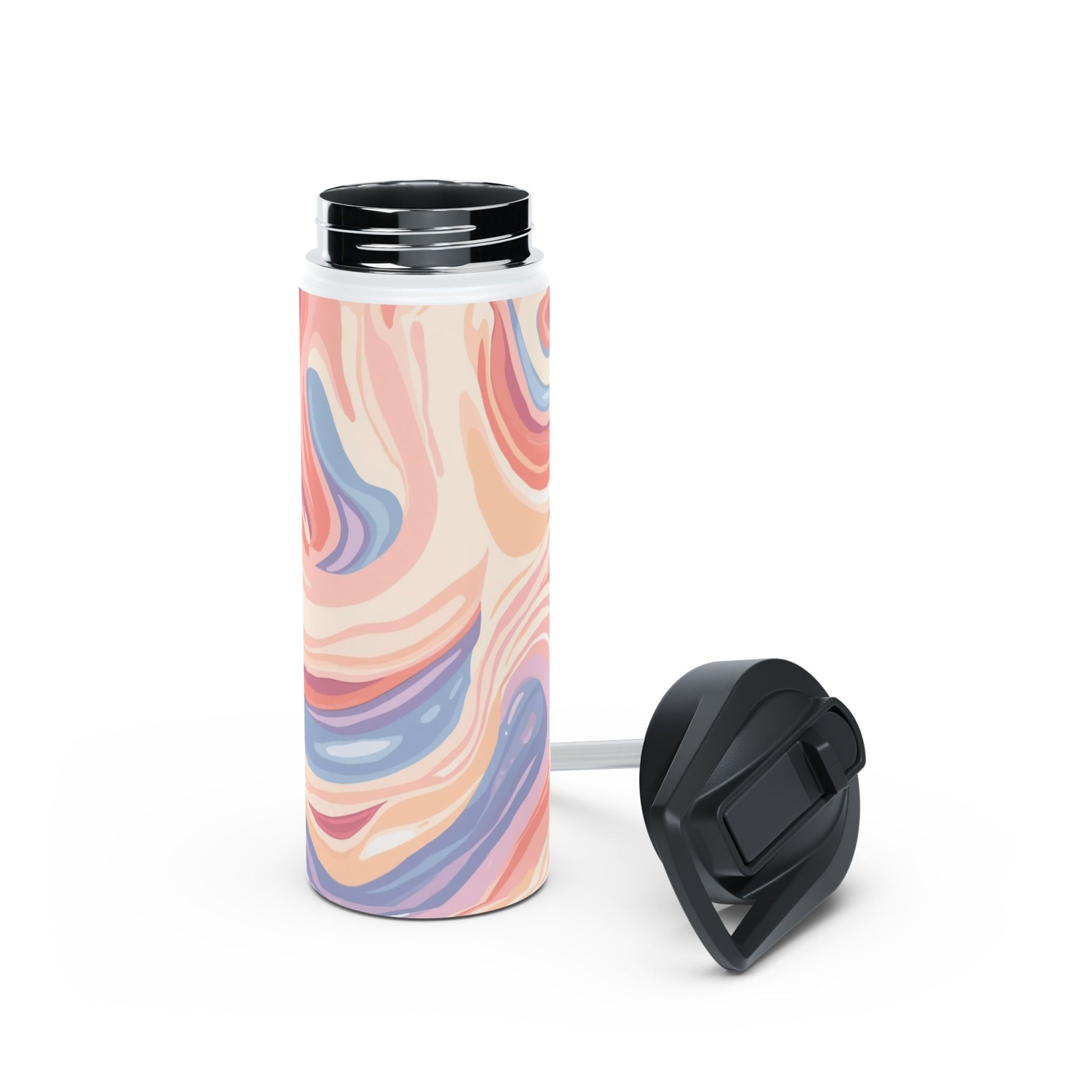 A stainless steel water bottle wrapped in a soft, flowing marble pattern of blush, peach and periwinkle. The matte, grainy finish gives it a tactile, modern feel in the hand, while double-wall insulation holds cold for up to 24 hours and warm for up to 12. A sturdy twist-on polypropylene lid with a carry handle makes it easy to clip onto a bag for busy days. Lightweight yet durable, it’s made in South Korea and finished with vibrant, fade-resistant printing that keeps the colors lively through daily use. Product features - Double-wall stainless steel keeps drinks cold up to 24 hours and warm up to 12 hours. - BPA-free construction; Intertek and RoHS certified for safety. - Matte, grainy finish with bright, high-resolution color printing. - Twist-on polypropylene lid with integrated carry handle for easy transport. - Available in 12oz, 18oz, and 32oz sizes; 100% stainless steel body. Care instructions - Hand wash only